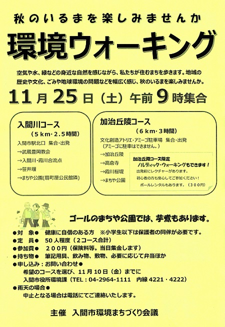 • 申し込み・お問い合わせ:希望のコースを選び、11月10日(金)までに入間市市役所環境課 Tel 04-2964-1111